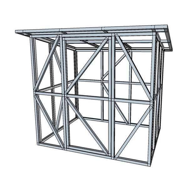 Этот компактный сарай с односкатной крышей отлично подходит для хранения инструментов и садовой техники. Конструкцию можно увеличить по длине на 1 метр. Каркас изготовлен из оцинкованных стальных профилей 40 × 40 мм. Входная дверь расположена на высокой стороне конструкции. Каркас поставляется в разобранном виде и упакован в коробки, что облегчает перевозку. Для обшивки можно использовать поликарбонат, металлические листы, деревянные доски либо другие подходящие материалы.