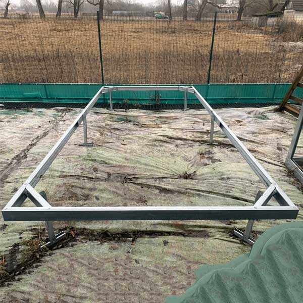 Конструкция фундамента теплицы из профиля из оцинкованной стали 89 х 42 мм. Профиль грунтового анкера 40 х 40 мм, длиной 310 мм.
