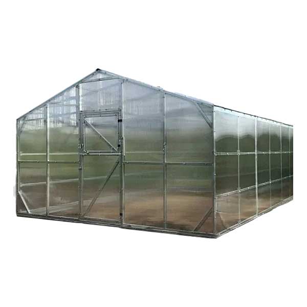 Каркас теплицы изготовлен из оцинкованного стального профиля 40 × 40 мм, обеспечивающего повышенную устойчивость к коррозии. На обеих сторонах конструкции предусмотрены двери с вентиляционным окном. Каркас поставляется в разобранном виде, что облегчает транспортировку. В стандартной комплектации используется поликарбонат толщиной 4 мм, который обладает достаточной прочностью и теплоизоляционными свойствами для сезонного использования. По желанию теплицу можно оснастить более толстым поликарбонатом: 6, 8, 10 или даже 16 мм.